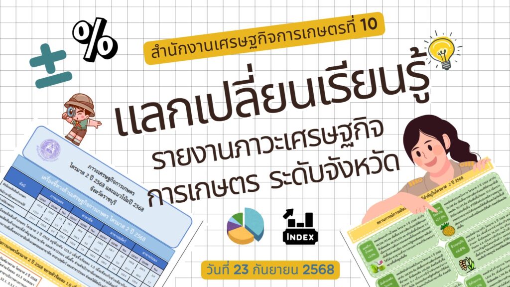 วันอังคารที่ 23 กันยายน พ.ศ. 2568 สำนักงานเศรษฐกิจการเกษตรที่ 10 จังหวัดราชบุรี (สศท.10) จัดกิจกรรมถ่ายทอดองค์ความรู้และแลกเปลี่ยนเรียนรู้แบ่งปันในองค์กร เรื่อง “รายงานภาวะเศรษฐกิจการเกษตร ระดับจังหวัด” โดยมีนายกิจษารธ อ้นเงินทยากร ผู้อำนวยการสำนักงานเศรษฐกิจการเกษตรที่ 10 จังหวัดราชบุรี เป็นประธาน พร้อมด้วยเจ้าหน้าที่ สศท.10 เข้าร่วมกิจกรรมในครั้งนี้ ณ ห้องประชุมสำนักงานเศรษฐกิจการเกษตรที่ 10