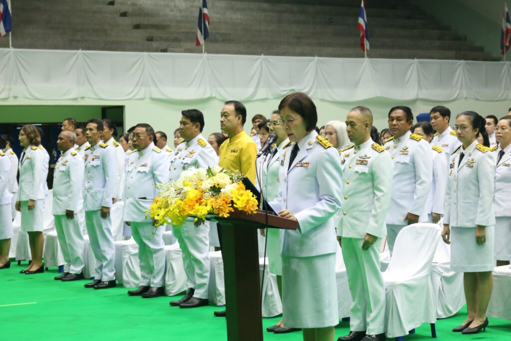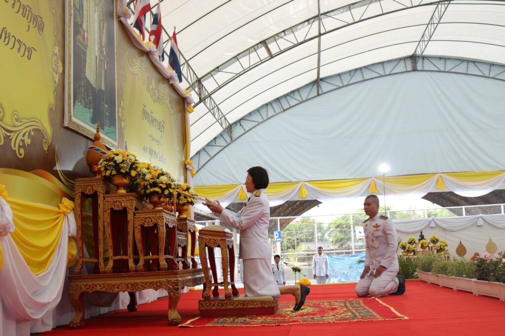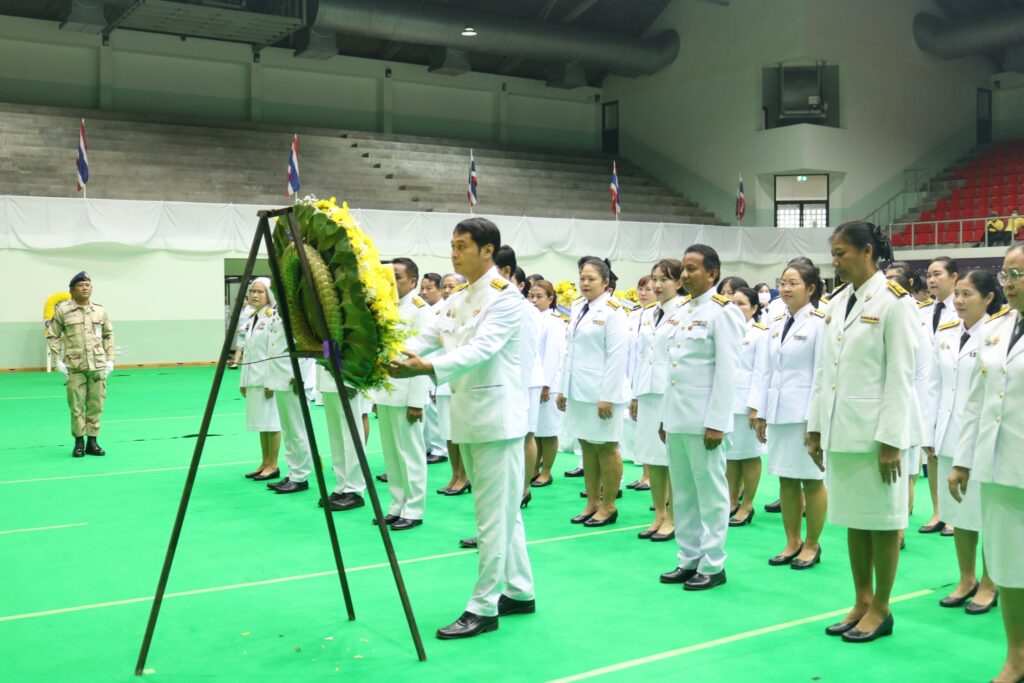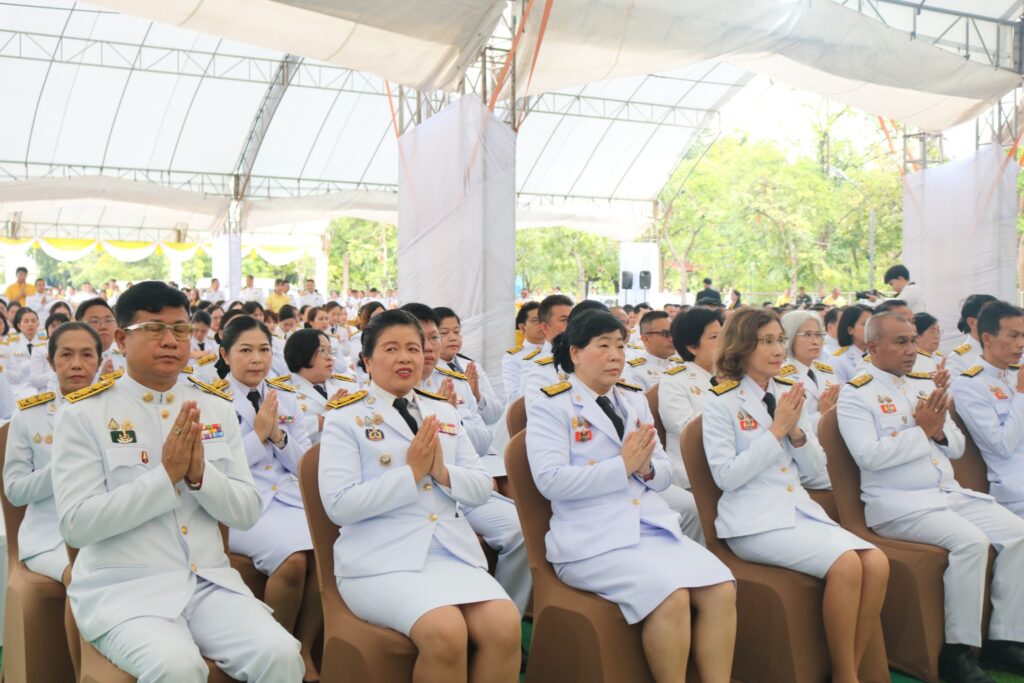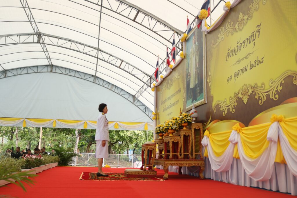 Following that, the Governor of Ratchaburi Province presided over the wreath-laying ceremony in front of the royal portrait of His Majesty King Bhumibol Adulyadej The Great and delivered the commemorative address in remembrance of His Royal Grace, on behalf of the civil servants and the people of Ratchaburi Province. They then jointly stood in silent tribute for 89 seconds.