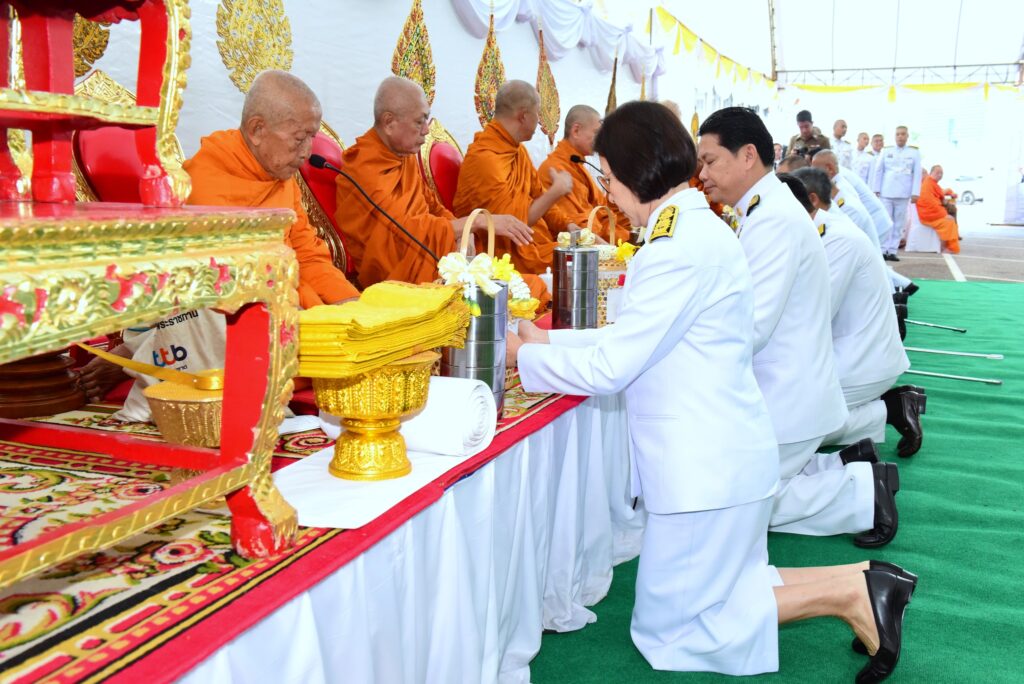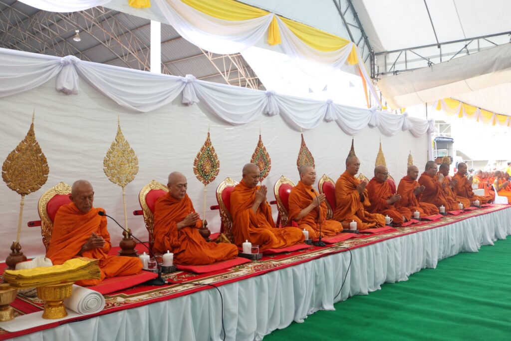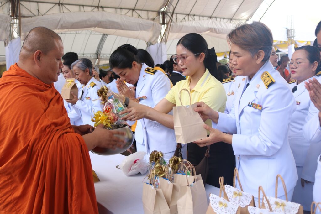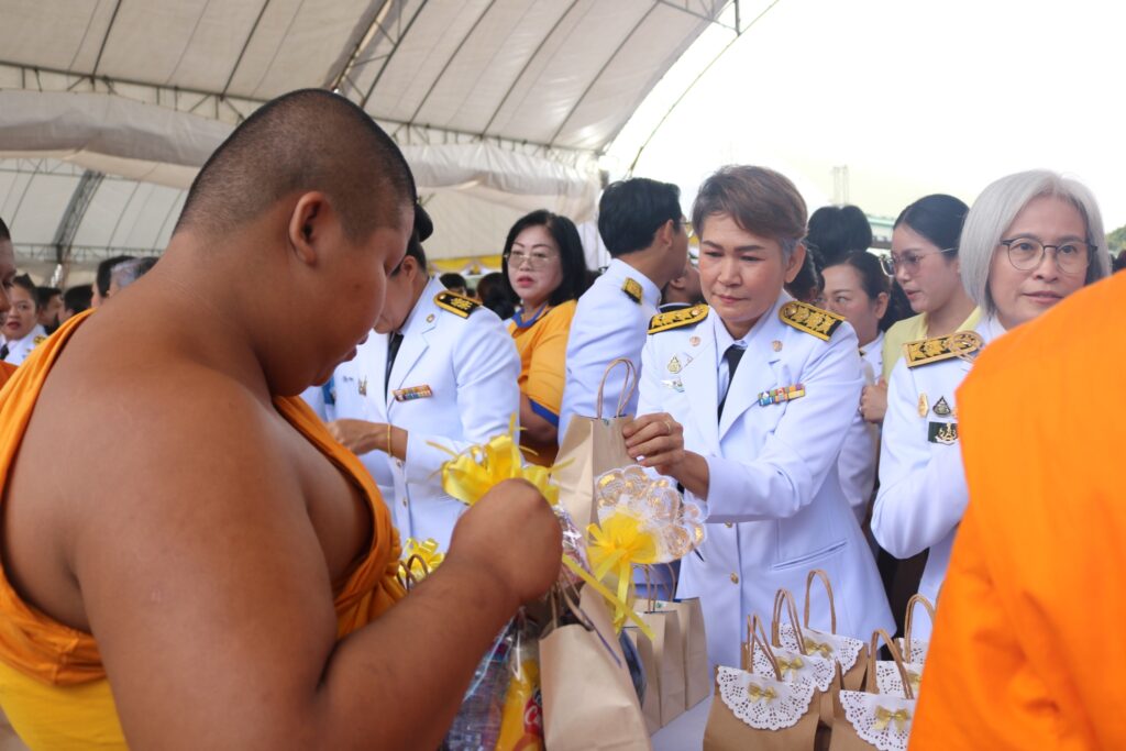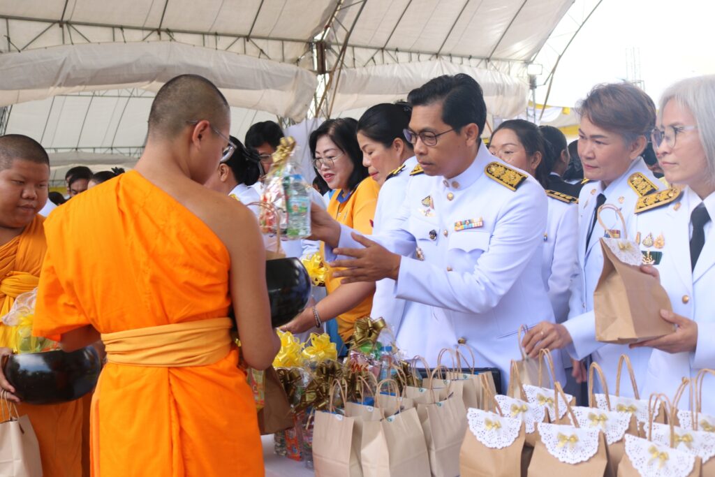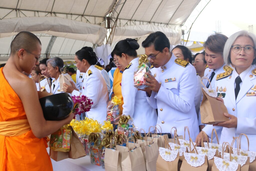 Ms. Thitilak Khampa, Governor of Ratchaburi Province, presided over the ceremony, lighting joss sticks and candles to worship the Triple Gem and lighting the Khrueang Thong Noi (small golden ceremonial offering) in front of the royal portrait. Within the ceremony, Phra Tham Panyaphon, Advisor to the Ecclesiastical Governor of Region 15 and Abbot of Wat Mahathat Worawihan, Ratchaburi Province, presided over the monastic section, leading the monks in chanting the Buddhist mantras. Subsequently, 89 monks and novices walked to receive alms, with government agencies, private sectors, and the public participating in the ceremony in full attendance.