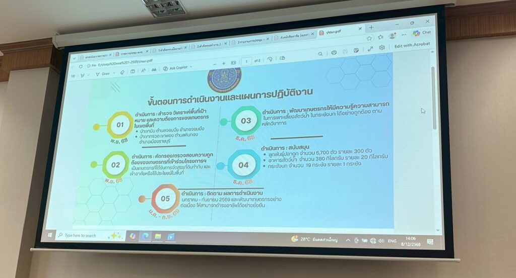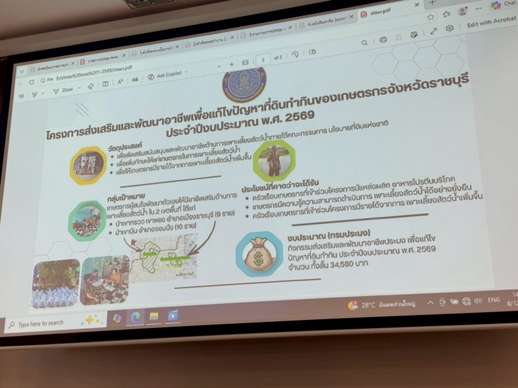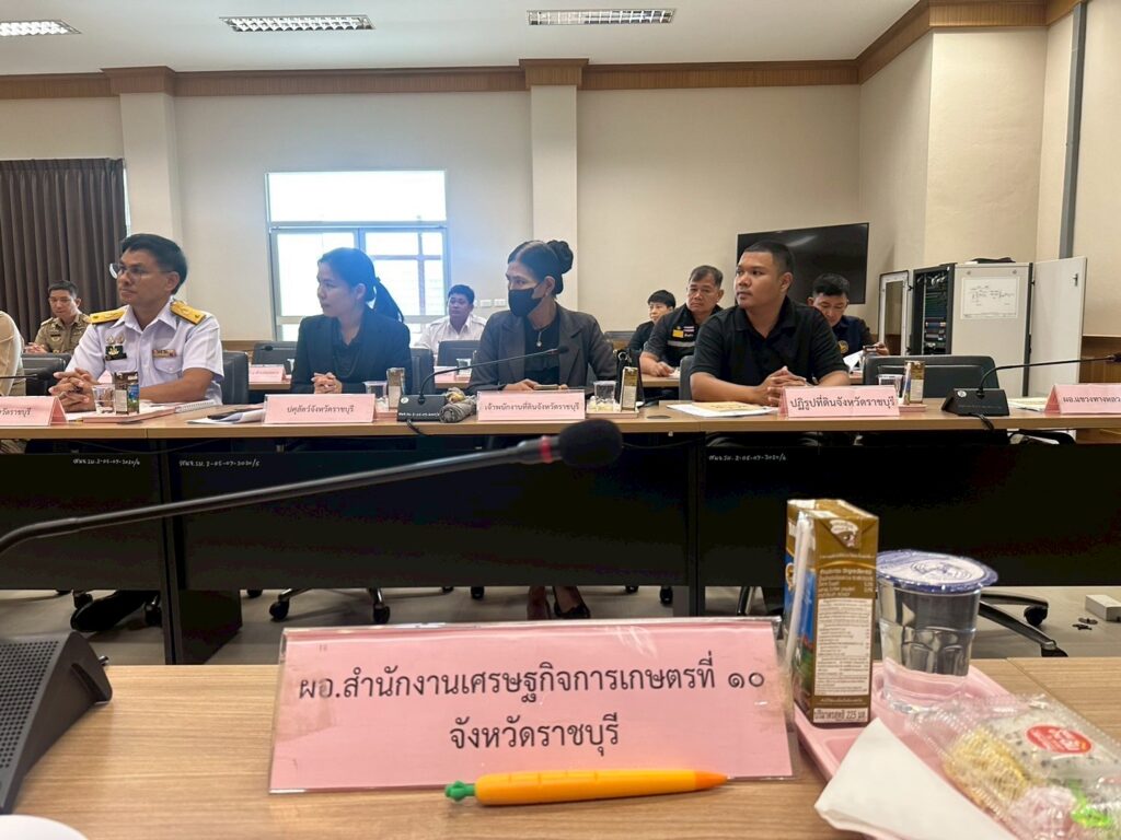 On Monday, 8 December 2025, Mr. Kijsart Onngernthayakorn, Director of the Office of Agricultural Economics Region 10, Ratchaburi Province, assigned Ms. Ratchata Wuttikitcharoen to attend the Meeting of the Working Group on Career Development and Marketing Promotion of Ratchaburi Province (Session 1/2026). The meeting was chaired by Ms. Warittha Sanguansermsri, Deputy Governor of Ratchaburi Province, and was held at Lamphachi Meeting Room, 5th Floor, Ratchaburi Provincial Hall.The objective of this meeting was to follow up on the implementation progress of the Career Promotion and Development Project aimed at addressing issues related to agricultural land use for farmers, in line with the six task frameworks under the Government’s Land Allocation Policy. For the year 2026, the Working Group has planned training programs to enhance farmers’ knowledge alongside career and marketing development plans, as well as initiatives to promote farmer group formation. Relevant agencies were assigned to carry out the planned activities and to report on future operational progress accordingly.